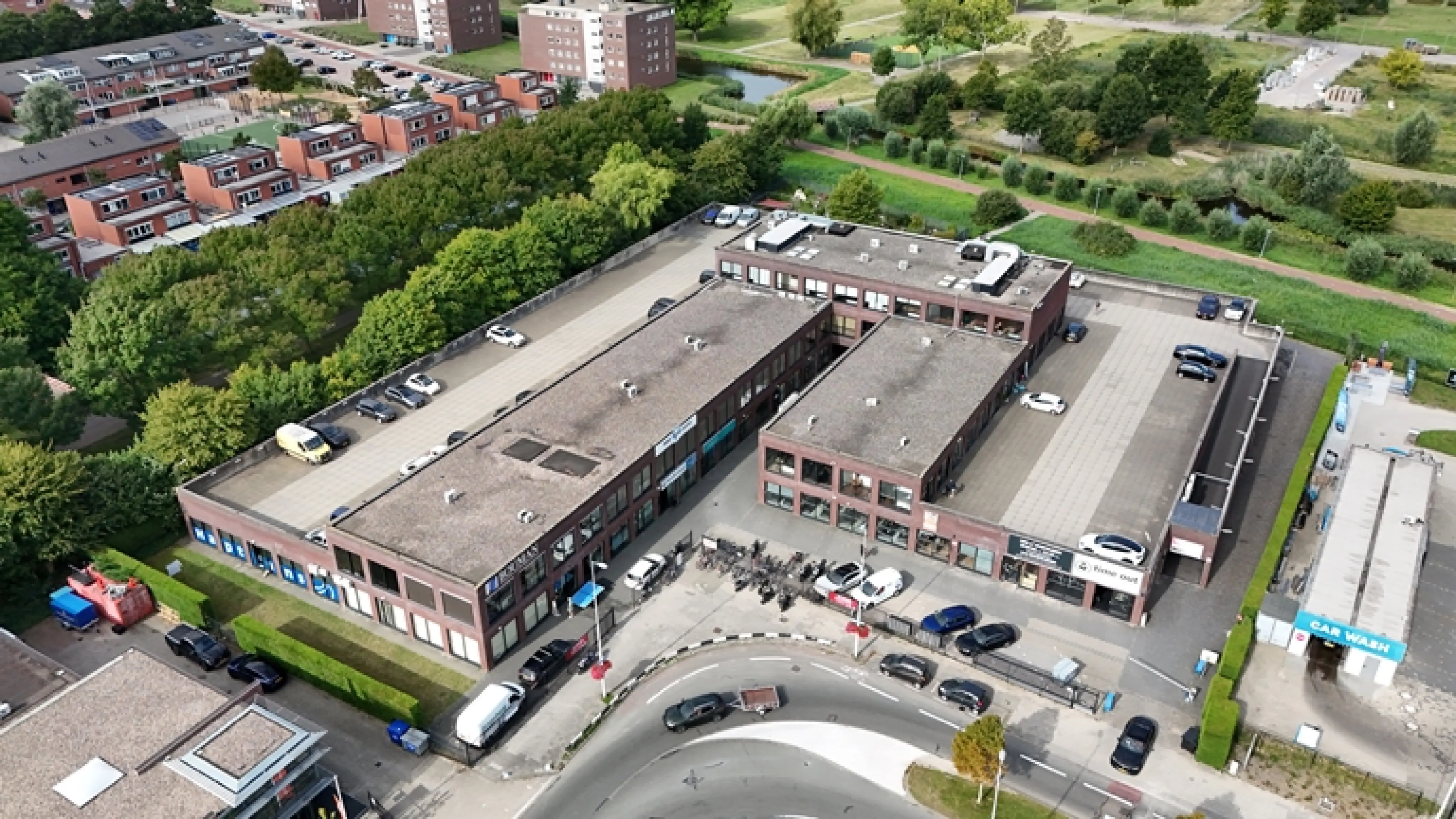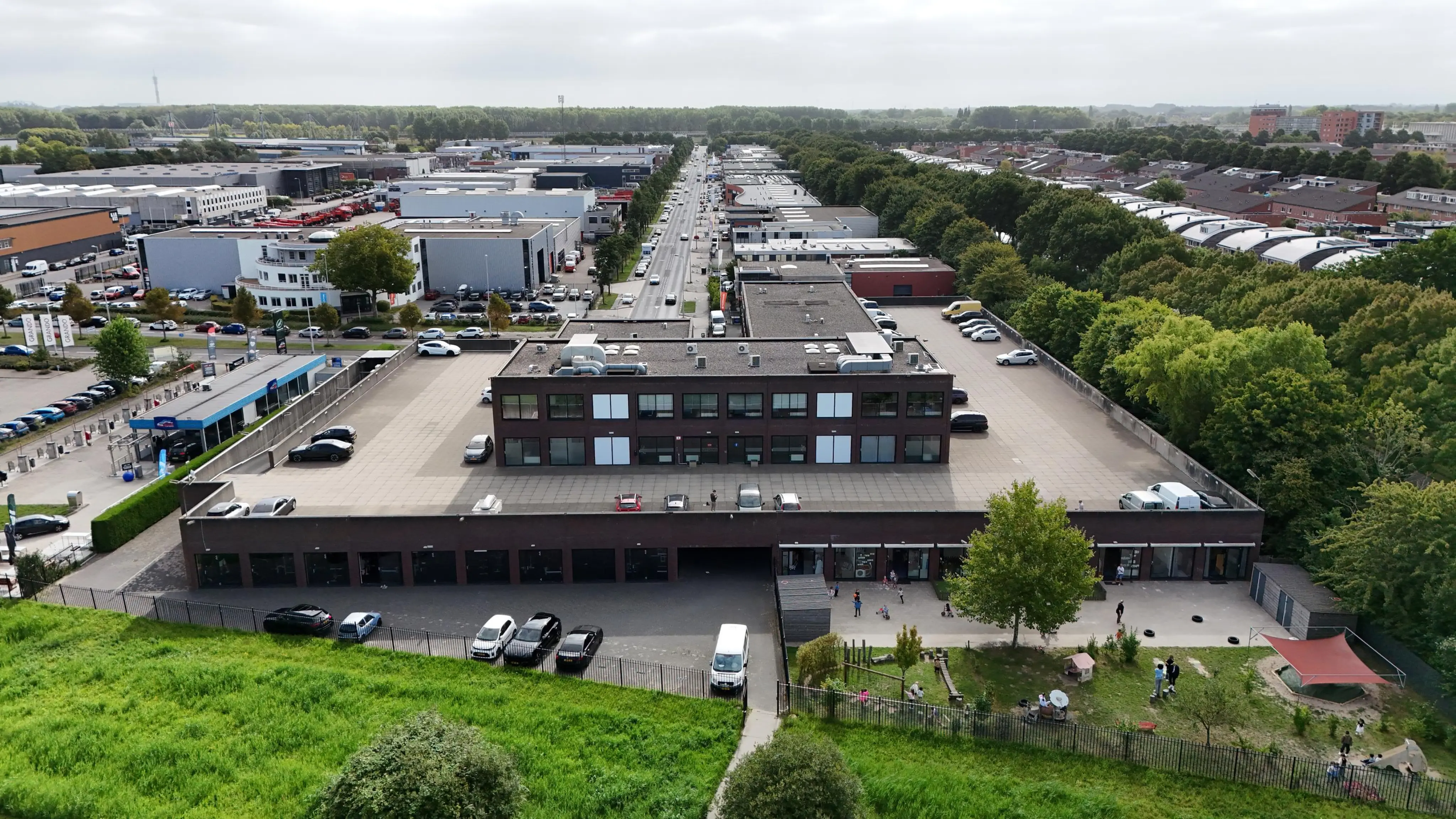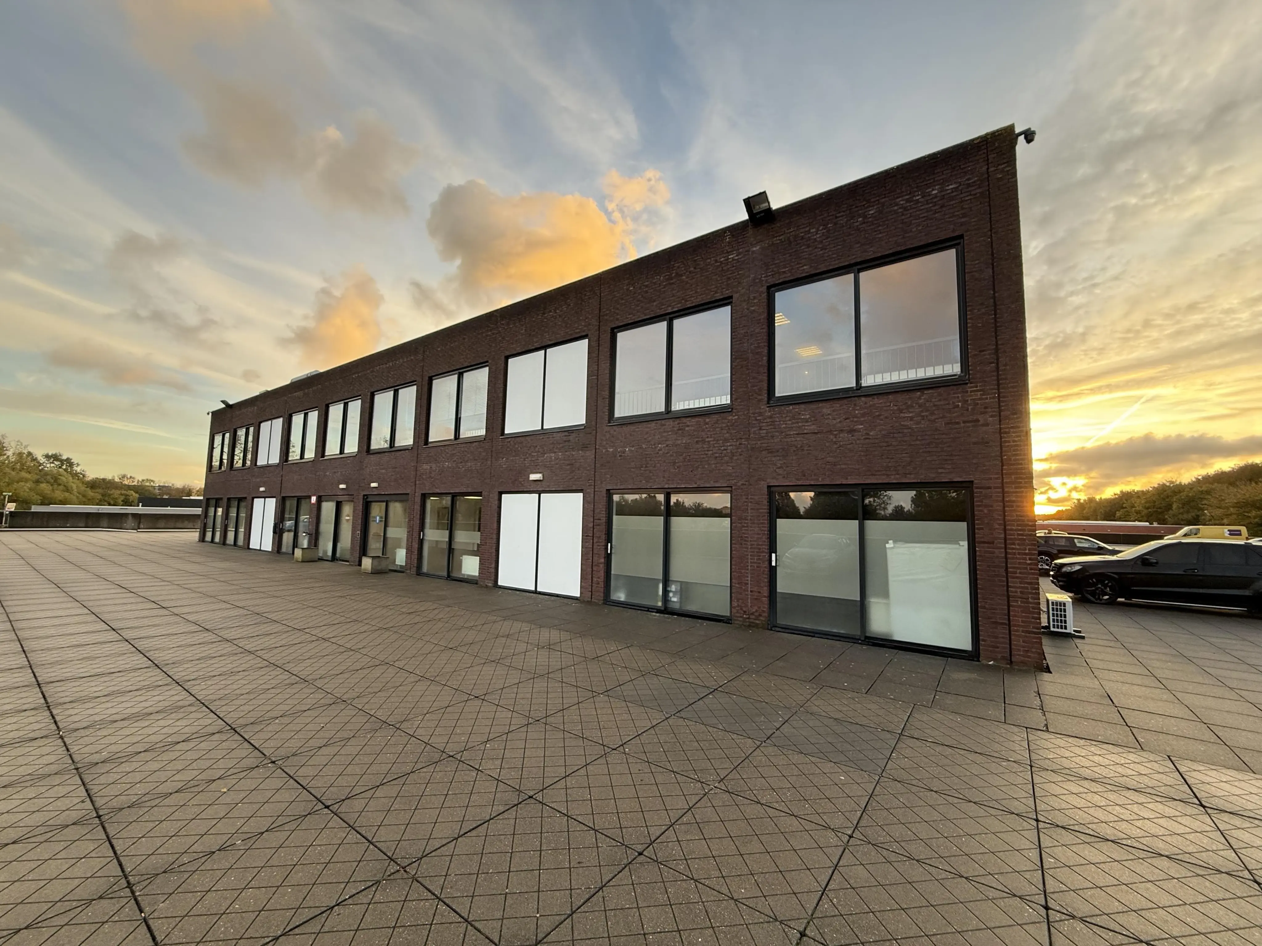 De entree van het kantoorgebouw is gelegen op de eerste etage, grenzend aan het parkeerdek.