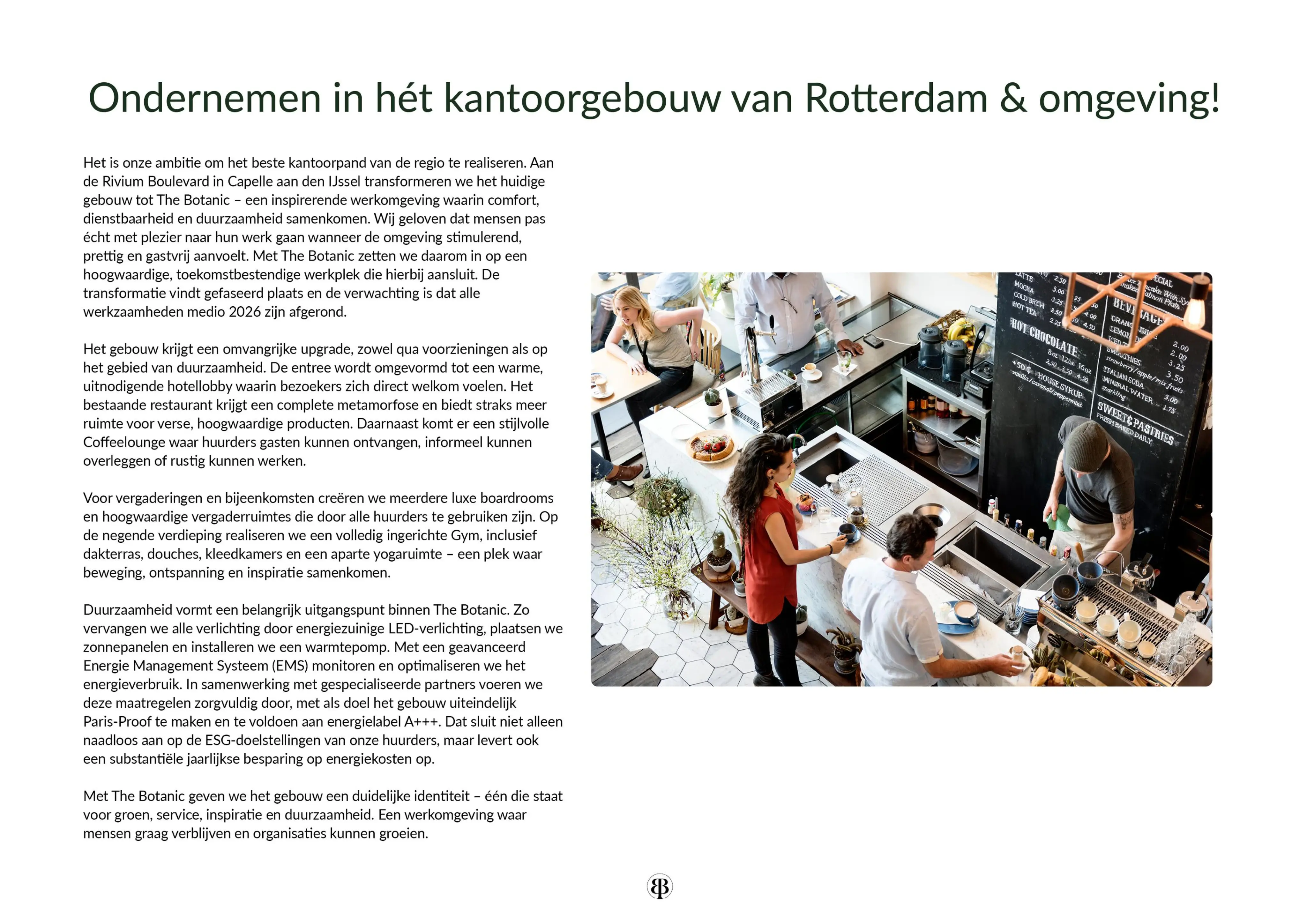 The Botanic onderscheidt zich bovendien door zijn sterke focus op duurzaamheid. Met de ambitie om het gebouw Paris Proof te maken en een energielabel A+++, biedt dit pand een toekomstbestendige werkomgeving met een eigentijdse uitstraling.